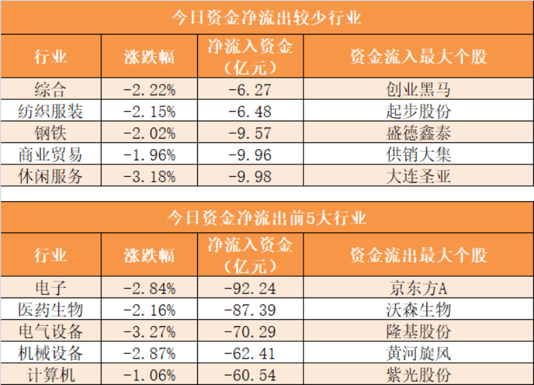 28个申万一级行业中,无一行业实现资金净流入,电子、医药生物、电气设备、机械设备等行业资金净流出规模居前,其中电子行业净流出92.24亿元居首。