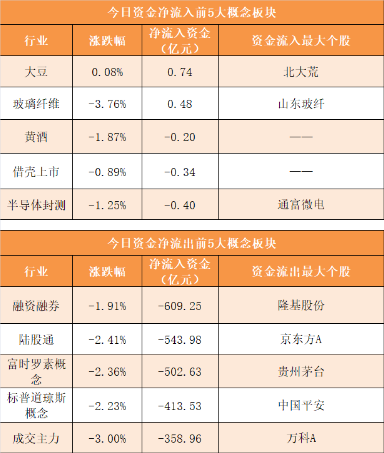 概念板块方面,今日大豆、玻璃纤维等概念板块资金呈现净流入,其中大豆概念净流入0.74亿元居首。
