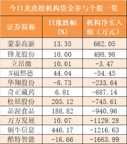 盘后龙虎榜数据显示,机构现身11股,其中蒙泰高新等2股呈现机构资金净买入,酷特智能等9股呈现机构资金净卖出。