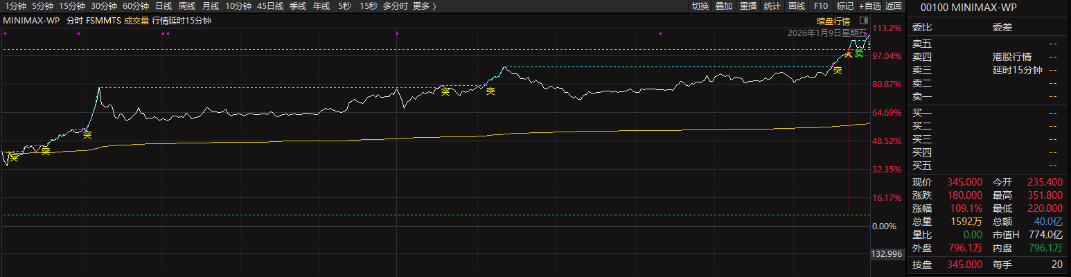 1月9日,成立仅4年的MiniMax(稀宇科技,00100.HK)以每股165港元的定价上限正式挂牌上市。截止收盘,该股股价达到345港元/股,涨幅109.09%,市值高达1054亿港元。