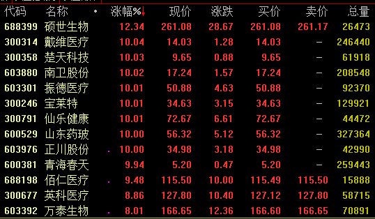 医疗保健板块今日盘中走势活跃,截至收盘,硕世生物大涨逾12%,戴维医疗、楚天科技、南卫股份、振德医疗、宝莱特、仙乐健康、山东药玻、正川股份、青海春天等涨停,佰仁医疗涨逾9%。