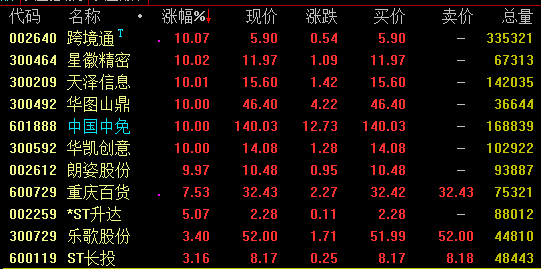 免税概念29日盘中再度走强,截至收盘,跨境通、星微精密、天泽信息、华图山鼎、中国中免、华凯创意等涨停,重庆百货涨逾7%。
