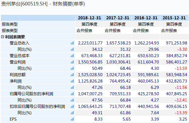综合来算,2019年单四季度,贵州茅台营收249.91亿元,100.45亿元,该数据相较于2018年第四季度的营业收入222.30亿元,净利润104.70亿元,同比增速分别为12.42%、-4.06%。