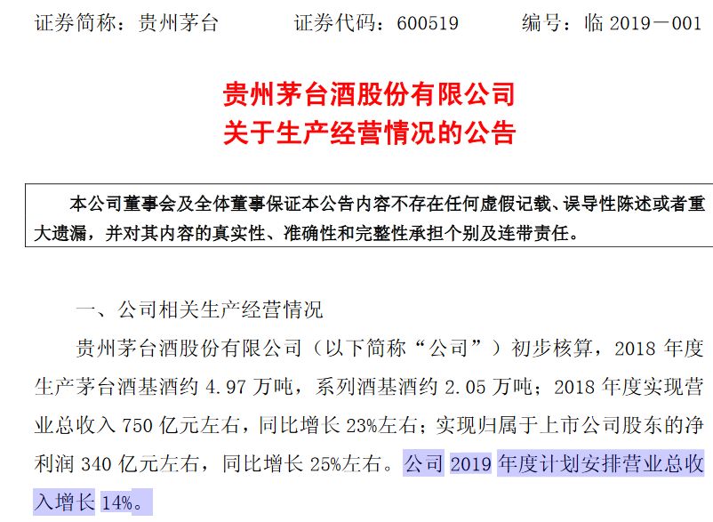 2020年第一个交易日,贵州茅台发布生产经营情况的公告,经初步核算,2019年度实现营收885亿元,同比增长15%;实现归属上市公司股东的净利润405亿元,同比增长15%。同时,2020年度计划安排营业总收入同比增长10%。