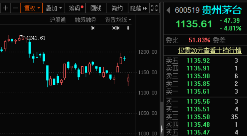 早间开盘,贵州茅台股价低开4.65%,之后继续下跌,最低跌5.66%,至1116元。