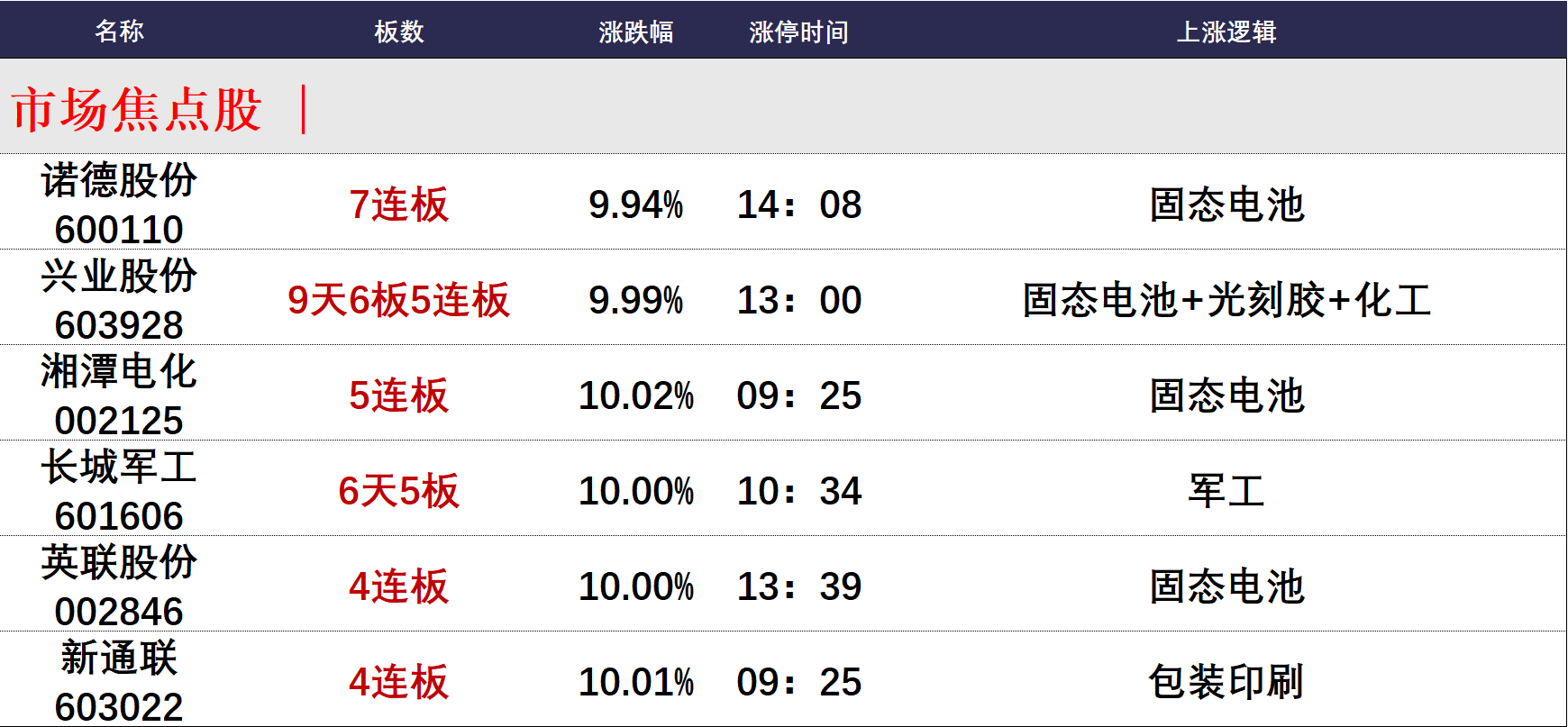 个股方面,全市场超3900只个股上涨,近百股涨逾9%。连板股热度高涨,昨日14只连板股中仅2只收跌。诺德股份晋级7连板,兴业股份、湘潭电化双双晋级5连板,长城军工、万里马均走出反包涨停。