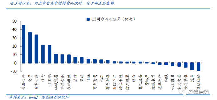 综合来看,外资昨日大举加仓了新能源汽车和科技板块。从周度视角来看,北上趋势回流以来,集中回流食品饮料、电子和医药生物等行业。根据测算,近三周以来,食品饮料、电子、医药生物、银行和计算机回流幅度居前,分别净流入44.90亿元、36.12亿元、33.19亿元、21.29亿元和20.96亿元。