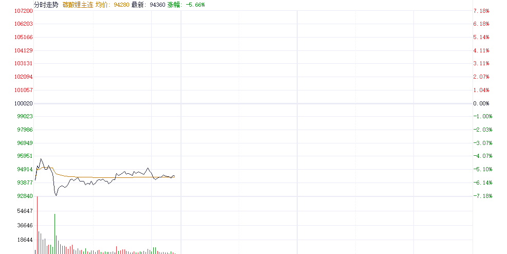 受此消息影响,碳酸锂期货早盘一度暴跌超7%,截至发稿时,跌幅收窄至5.66%,报94360元/吨。