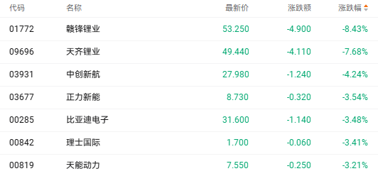 今日港股锂电池股集体走弱。截至发稿,赣锋锂业(01722.HK)下跌8.43%,天齐锂业(09696.HK)跌7.68%,中创新航(03931.HK)跌4.24%。