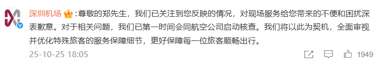 当日傍晚,深圳机场官方微博在郑智化这条微博的评论区回复称,“尊敬的郑先生,我们已关注到您反映的情况,对现场服务给您带来的不便和困扰深表歉意。对于相关问题,我们已第一时间会同航空公司启动核查。我们将以此为契机,全面审视并优化特殊旅客的服务保障细节,更好保障每一位旅客顺畅出行。”