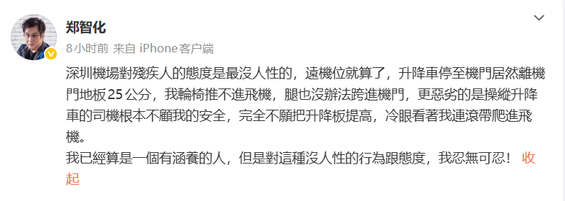 10月25日下午,歌手郑智化在微博发文吐槽深圳机场,文中称该机场对残疾人不友好,“远机位就算了,升降车停至机门居然离机门地板25公分,我轮椅推不进飞机,腿也没办法跨进机门,更恶劣的是操纵升降车的司机根本不顾我的安全,完全不愿把升降板提高,冷眼看着我连滚带爬进飞机。”