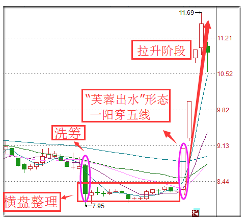 “芙蓉出水”是K线与均线结合的产物,指横盘整理或下跌过程中,某一根长阳线突破短期均线系统(如5日、10日、20日均线),即形成芙蓉出水。