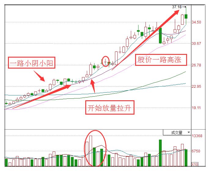 该股股价先是一路小阴小阳的上升走势,随后开始放量拉升,收出连续十字星,多头进行洗盘,缩量后再次走出一波漂亮的上攻走势。