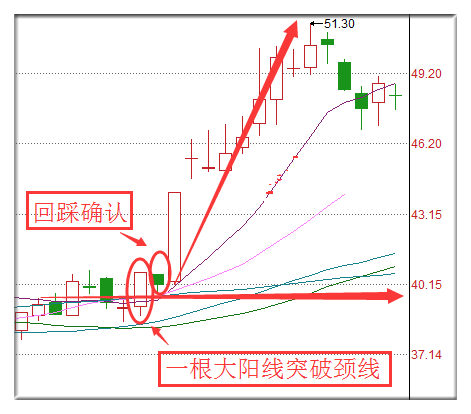 该股股价以一根大阳线突破颈线,先是拉升,后缩量回调确认,最后拉升。