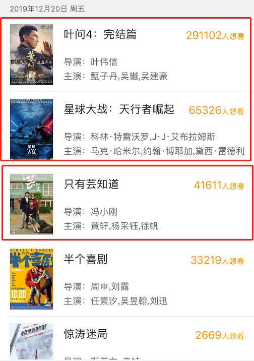今年贺岁档开局竞争激烈,除了《只有芸知道》。甄子丹主演的《叶问4》、国外大片《星球大战:天行者崛起》、《半个喜剧》、《惊涛迷局》、《聊斋新传之奇女子》也在今天上映同台竞技。
