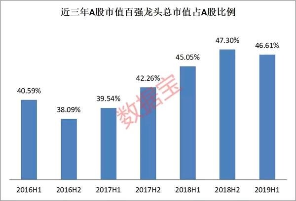 统计结果显示,近三年A股上市公司龙头效应稳步上升,2018年下半年百家市值龙头公司总市值在A股中的占比创下47.3%的阶段性新高,这一比值较2016年下半年上涨了9.2个百分点。