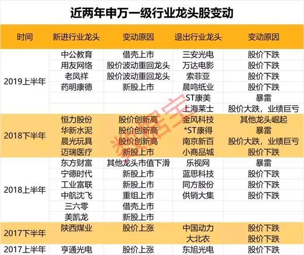 数据宝以半年为统计周期对2017年以来申万一级行业龙头公司的变动情况进行统计,当上市公司在行业内的市值排名在两年内由第五名之外闯入前三名时,认定该公司为当期新进行业龙头;当上市公司的市值在两年内由行业前三名持续跌出行业前五名,则认定该公司不再是行业龙头。