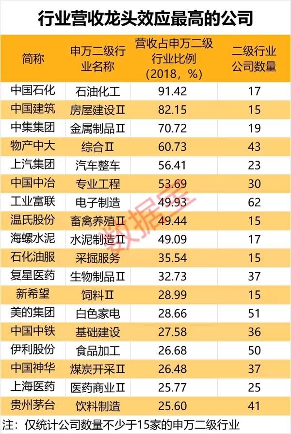 根据2018年年报数据统计,A股共有18家申万二级行业龙头公司的营业收入在行业营收中的占比超过25%(仅统计上市公司数量超过15家的申万二级行业)。中国石化、中国建筑、中集集团、物产中大、上汽集团和中国中冶的营收份额超过了行业内上市公司总营收的50%,在细分行业中拥有绝对的霸主地位。