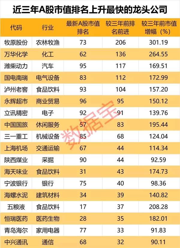 其中,牧原股份近三年股价一路上扬并于近期创下历史新高,带动公司三年内日均市值增长301%,市值一举突破千亿元大关,排名前进206名,市值增幅和赶超的公司数量均为A股龙头公司之最。此外,万华化学、潍柴动力、国电南瑞、泸州老窖、永辉超市、立讯精密和中国国旅的市值排位较三年前也均上升了80名以上。