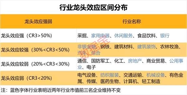 最新数据显示,采掘、家用电器、休闲服务、食品饮料和银行业的CR3超过50%,行业龙头效应最强。轻工制造、计算机和医药生物行业的龙头效应最弱,CR3均不足15%。