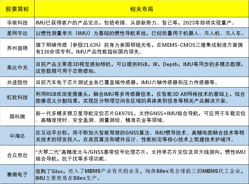 据财联社不完全统计,在IMU领域有所布局的上市公司包括赛微电子、华依科技、星网宇达、共进股份等,具体如下: