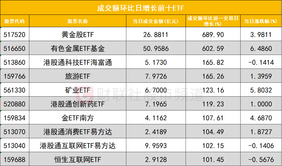 从成交额环比增长前十的ETF来看,黄金股ETF(517520)成交额环比增长689%位居首位;有色金属ETF基金(516650)成交额环比增长602%位居次席。