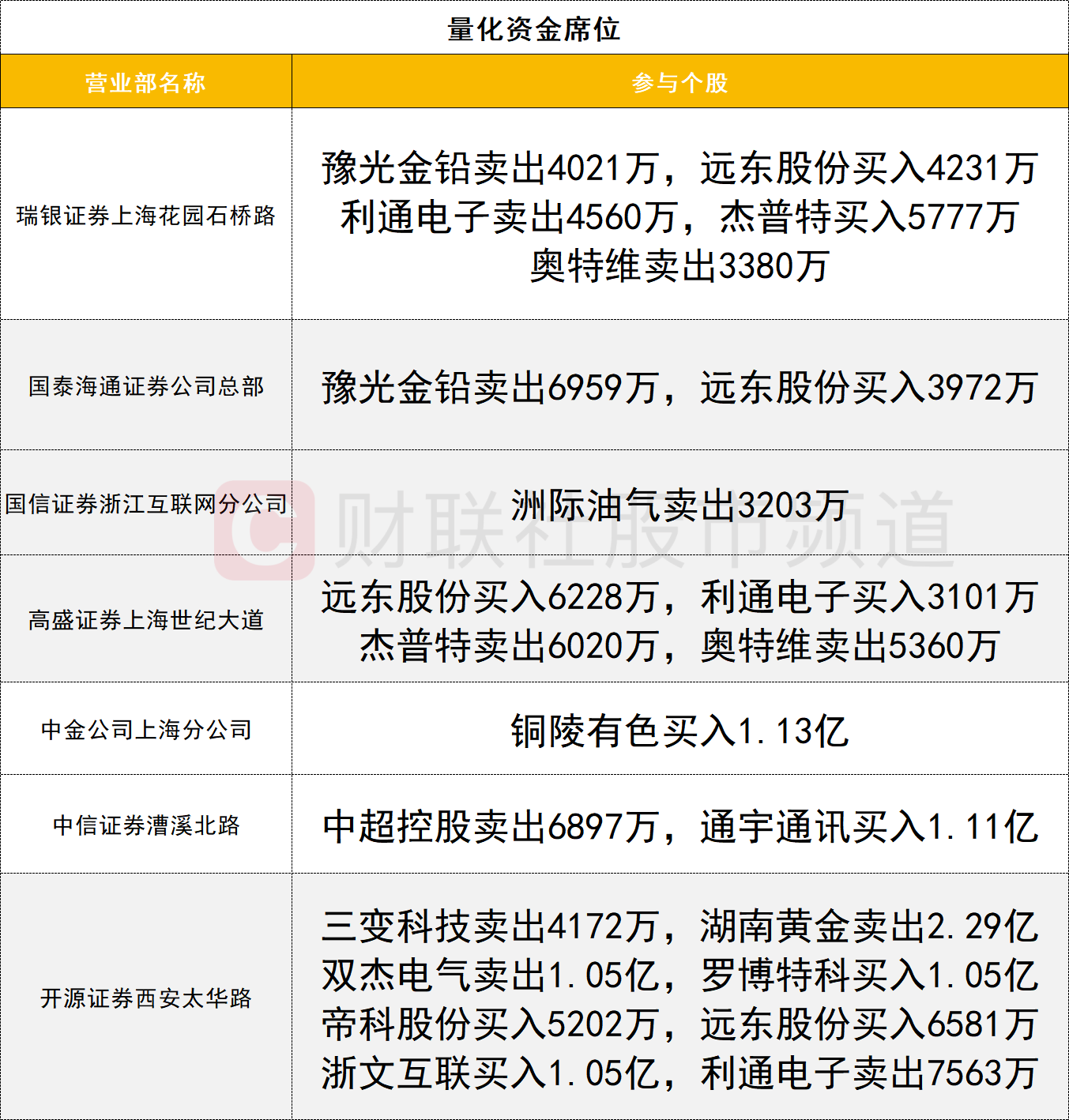 量化资金活跃度有所提升,湖南黄金走出7天6板,遭一家量化资金(开源证券西安太华路)卖出2.29亿。