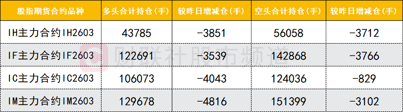 四大期指主力合约中,IH、IF、IC、IM合约多空双方均减仓,IC、IM合约多头减仓数量较多。