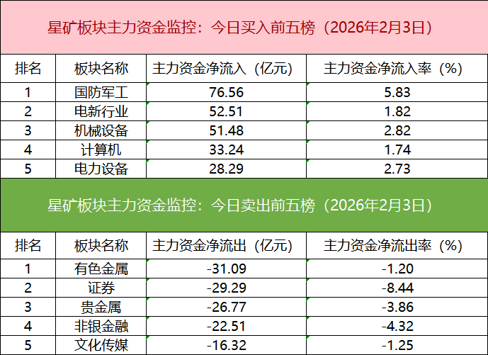 从主力板块资金监控数据来看,国防军工板块主力资金净流入居首。