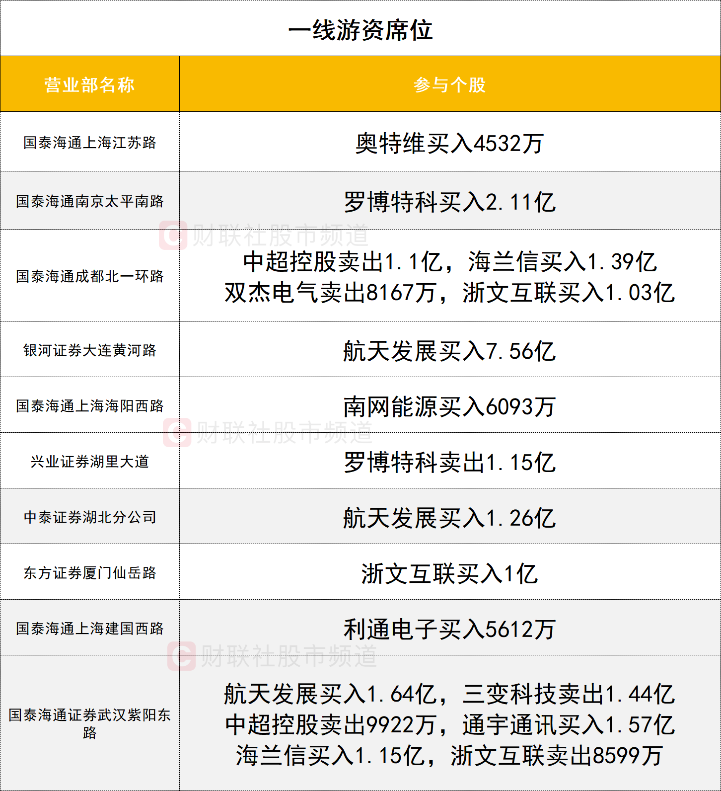一线游资活跃度有所提升,商业航天人气股航天发展获三家一线游资(中国银河大连黄河路、国泰海通证券武汉紫阳东路、中泰证券湖北分公司)分别买入7.56亿、1.64亿、1.26亿。CPO概念股罗博特科获一家一线游资(国泰海通证券南京太平南路)买入2.11亿。