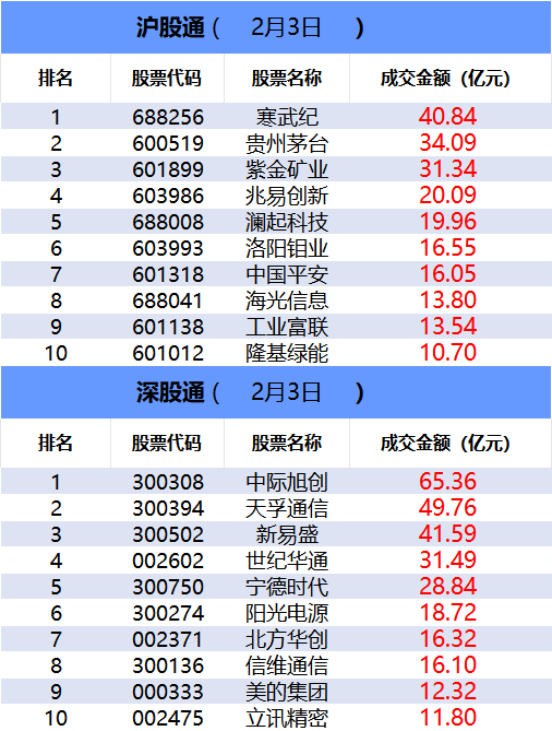 从沪股通前十大成交个股来看,寒武纪位居首位;贵州茅台和紫金矿业分居二、三位。