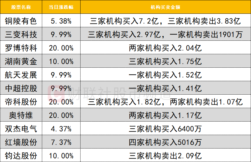 今日龙虎榜机构活跃度较高,买入方面,航天发展今日涨停,获一家机构买入1.52亿。有色金属板块探底回升,其中铜陵有色获三家机构买入7.2亿,同时遭三家机构卖出3.83亿;湖南黄金获三家机构买入1.75亿。