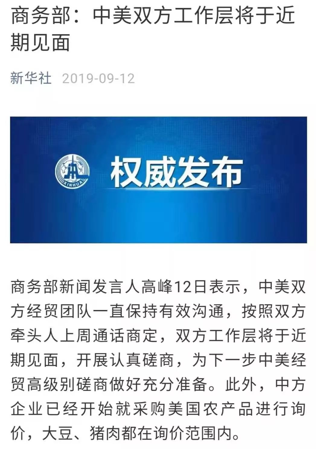 高峰回应,中方对美方释放的善意行动表示欢迎。同时,中方企业已经开始就采购美国农产品进行询价,大豆、猪肉都在询价范围内。希望双方继续相向而行,采取实际行动,为磋商创造良好条件。这有利于中美双方,也有利于整个世界。
