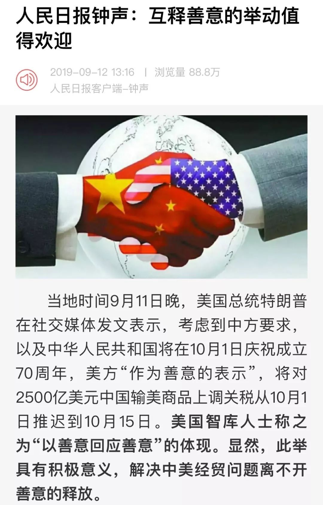 人民日报刊发了题为《互释善意的举动值得欢迎》的评论,文章指出,美方“作为善意的表示”,美国智库人士称之为“以善意回应善意”的体现。显然,此举具有积极意义,解决中美经贸问题离不开善意的释放。