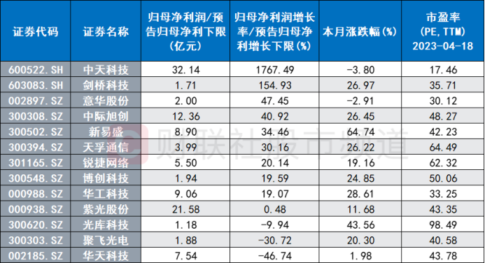 从业绩表现来看,已披露季报的3只CPO概念股今年一季度均实现盈利,其中,剑桥科技业绩增速暂居首位,华工科技归母净利润同比增长近36%,光库科技业绩增速则有所下滑。若统计去年年报(及预告)数据,中天科技、剑桥科技业绩(净利/预告归母净利下限)实现翻倍正增长,此外,意华股份、中际旭创、新易盛、天孚通信、锐捷网络业绩增速也相对靠前。