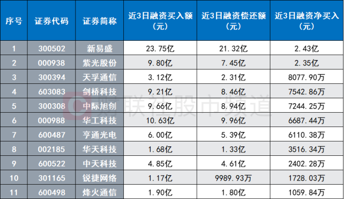随着AI概念延续热度,CPO板块作为硬件端方向人气高涨,杠杆资金也连日加仓CPO概念股。截止4月18日数据,板块获融资资金连续12日净买入,其中,在4月10日及18日两次净买额超5亿元。具体个股方面,以近3日数据统计,累计共有11股融资净买规模超千万元,其中,新易盛、紫光股份双双获2亿元以上加仓,天孚通信、剑桥科技、中际旭创等股的增持规模也居前。