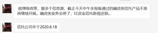 6月18日,融资类信托业务被叫停的消息迅速在市场发酵。有消息说“核弹级政策,据多个信息源,截至6月18日中午未报备通过的融资类信托产品不准再继续开展。融资类业务全停了,比资金信托新规还狠。”