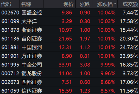 4月26日,券商板块高开高走。申万证券Ⅱ指数午后快速拉升,收盘大涨6.04%,全天成交512亿元。成份股掀起涨停潮,其中国盛金控竞价阶段涨停,太平洋、浙商证券、首创证券、中国银河、方正证券、中金公司、锦龙股份等券商股均于午后或尾盘封板涨停。