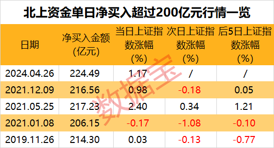 回顾历史,北上资金共有5次单日成交净买入额超过200亿元,2019年有1次,2021年出现3次,2024年目前为1次。