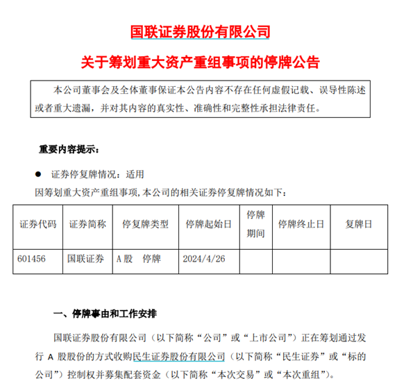 同日晚间,国联证券公告重大资产重组事项。公司正在筹划通过发行A股股份的方式收购民生证券控制权并募集配套资金。本次交易预计构成重大资产重组,公司A股股票将于2024年4月26日开市起停牌,预计停牌时间不超过10个交易日。