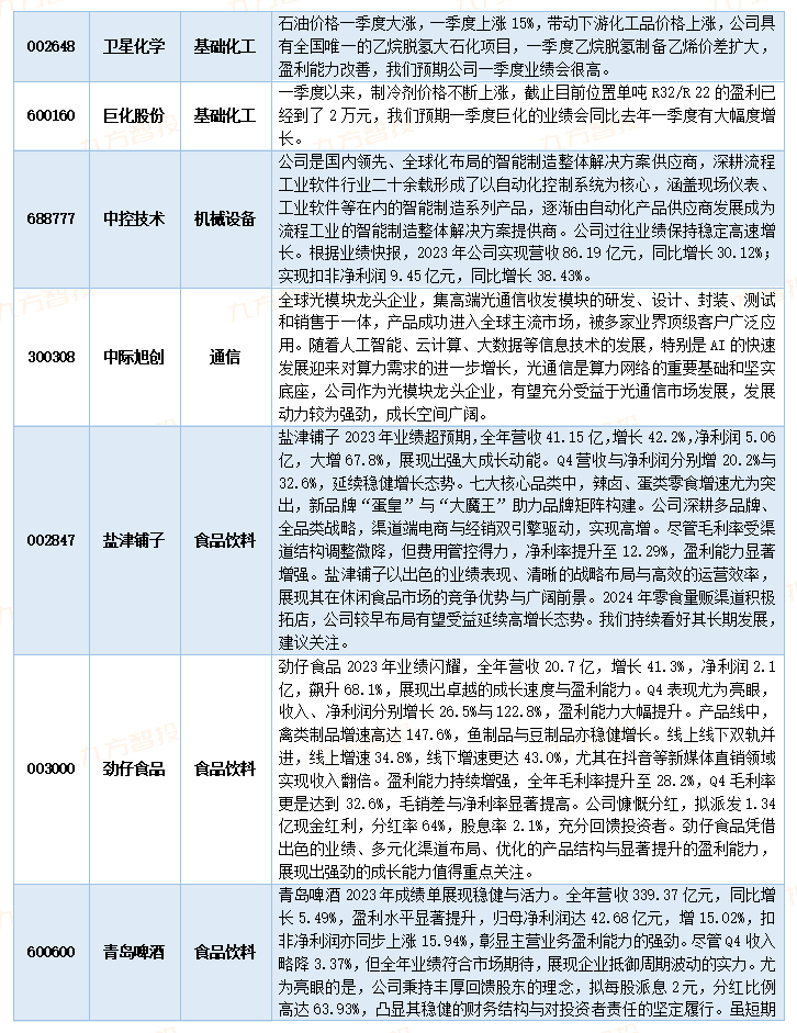2024年以来,原油一季度上涨14%,WTI原油价格到目前81美金/桶。未来二季度原油价格还是继续看涨。原油的价格支撑,叠加今年一季度国内部分经济需求复苏,一些化工品价格也上涨较多,越是接近原油端的化工品涨价越多,传导效应较好。因此,石化炼化企业的一季度业绩预期乐观,例如卫星石化等公司。