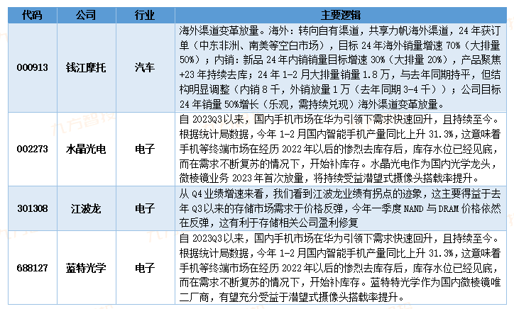 展望一季度,我们认为,受益于消费电子复苏、AI需求提振,Q4已经出现业绩拐头苗头的公司或延续增长,同时由于行业出清及需求复苏,我们或有望看到行业更大范围的恢复。从数据上看,根据统计局数据,国内1-2月智能手机产量增长超过30%;而根据中国闪存市场,存储市场价格自2023Q3以来快速反弹。这些都是行业正在恢复的数据佐证,基于此,我们对电子行业一季报有比较乐观的预期。