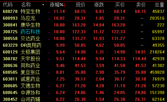 医药板块今日盘中再度活跃,截至收盘,特宝生物涨逾11%,马应龙、康华生物、药石科技、贝达药业、奥翔药业等涨停,太极集团、天宇股份、同和药业等涨幅超9%。
