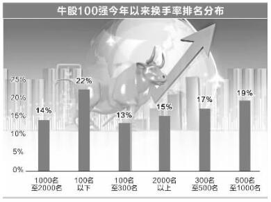 从换手率来看,把A股按换手率高低排序,换手率前100名中,牛股100强占了18席,占比18%;换手率前500名中,牛股100强占49席,占比49%;换手率前1000名中,牛股100强占71席,占比71%。而牛股100强中,只有2只股票的换手率排名在3000名之后。