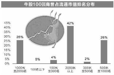 按流通市值排名,牛股100强中只有3只股票的流通市值挤进前100名,位列前500名的有26只,位列前500名~1000名的有20只,位列1000名~2000名的有32只。也就是说,流通市值排名前500名~2000名的占近80%。