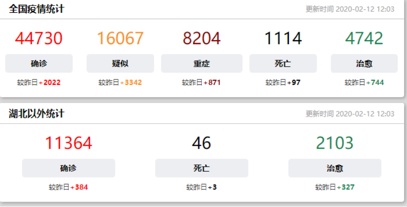 截至发稿,全国新冠肺炎累计确诊病例44730例,疑似病例16067例,死亡1114例,治愈出院4742例。湖北新增确诊病例加速下降,湖北省外地区新增确诊人数连续8日下滑。