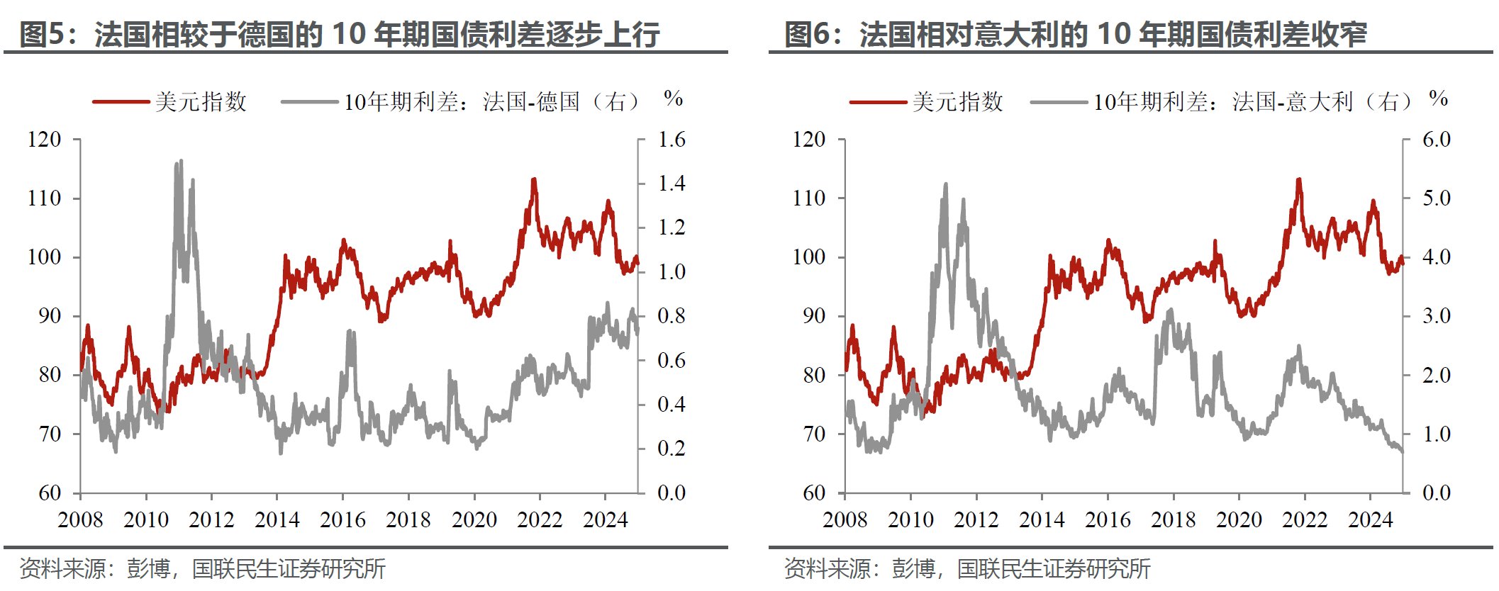 但如果德国以外的欧洲国家“按捺”不住呢?典型的比如法国,财政整顿面临挑战:一方面,当前执政党在国会已经“失势”,因为缩减赤字的问题,两年内四换总理;另一方面,2027年初将是法国大选,明年也会是各党派博弈的关键年份。而如果以法国为代表的高债务国家财政整顿不利,带来的与德国国债利差扩大,会是导致欧元走弱、美元反弹的重要导火索。