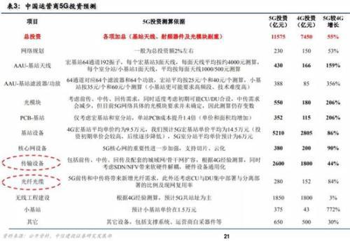 从上表之中,就可以发现基站设备的投资额最大,预估达5000多亿元,其次是传输设备,预估投资额达2600亿。