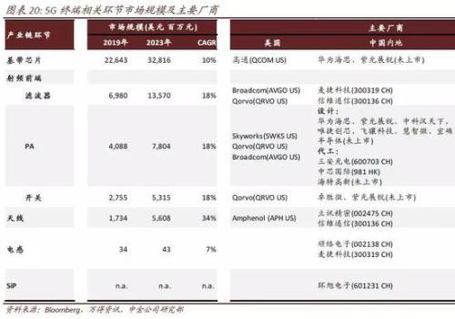 中金公司认为,品牌5G手机将陆续上市,今年明年渗透率持续提升。我们此前预计在中性情景下2019~2021年5G手机出货量分别达到500万、9500万和2.6亿部,伴随全球5G建设与终端进度提速,5G手机渗透进展将有机会超出我们预期。建议关注:1)射频前端及射频电感:卓胜微(300782)、顺络电子(002138);2)天线:信维通信;3)散热与屏蔽件:中石科技、飞荣达;4)电池:德赛电池(000049)、欣旺达(300207)。