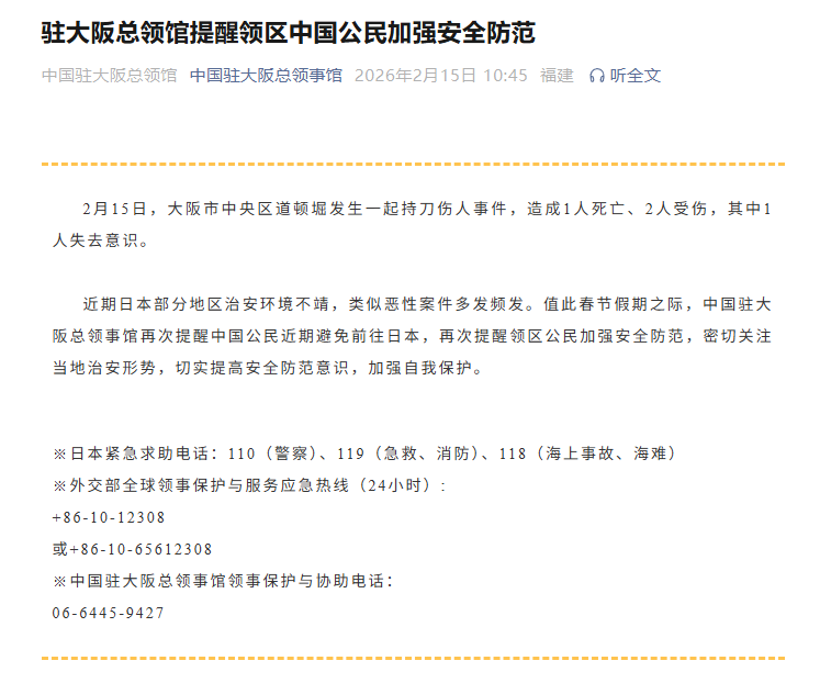中国驻大阪总领馆提醒领区中国公民加强安全防范:2月15日,大阪市中央区道顿堀发生一起持刀伤人事件,造成1人死亡、2人受伤,其中1人失去意识。